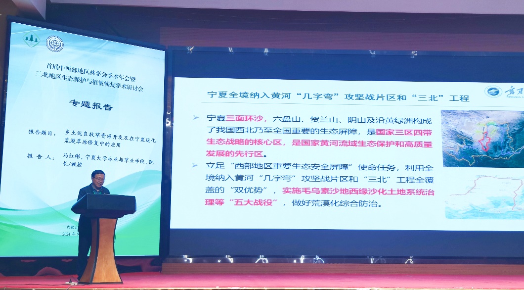 为深入学习贯彻习近平总书记在加强荒漠化综合防治和推进“三北”等重点生态工程建设座谈会上重要讲话精神,以及国家林业和草原局关于《关于全面推进三北工程科学绿化的实施意见》,强化三北工程攻坚战技术支撑,促进中西部地区林草科技交流与合作,中国林学会于2024年9月24日在内蒙古阿拉善左旗举办“首届中西部地区林学会学术年会暨三北地区生态保护与植被恢复学术研讨会”,来自国内林业科学及相关领域专家学者共150余人参加。学院院长马红彬、副院长田佳、教授张萍及青年教师郑翔、何莹莹、海旭莹等人受邀参加了研讨会。会上,院长马红彬教授作了题为“乡土优良牧草资源开发及在宁夏退化荒漠草原修复中的应用”的报告。