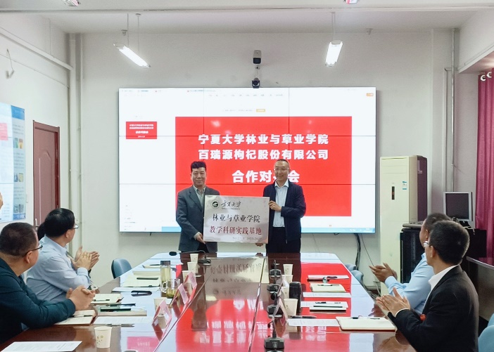 会上,马红彬院长与百瑞源枸杞股份有限公司副总经理郝万亮分别代表双方正式签订了《框架合作协议》和《教学科研实践基地合作协议》;学院书记贺海明、李翔老师分别向百瑞源枸杞股份有限公司授予了“时时彩