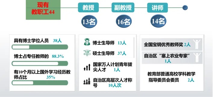 学院现有教职工44人,其中教授13人,副教授17人,讲师14人;具有博士学位人员39人,博士占专任教师的88.6%,有10个月以上国外学习经历教师占比35%;有博士生导师12人,硕士生导师39人。国家万人计划青年拔尖人才1人,中国科学院“西部之光”青年学者5人;自治区高层次人才称号10人次;自治区青年托举人才5人,全国宝钢优秀教师奖2人,自治区“塞上农业专家”1人;教育部普通高校学科教学指导委员会委员2人。