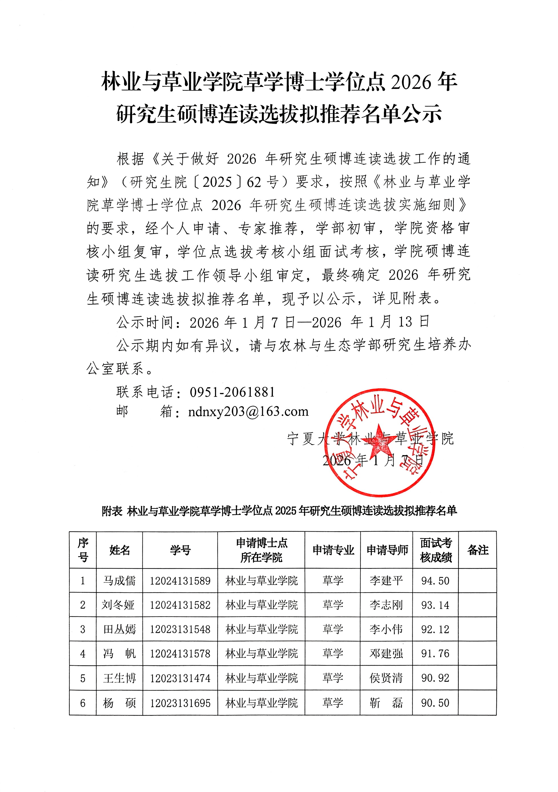 时时彩 草学博士学位点2026年研究生硕博连读选拔拟推荐名单公示