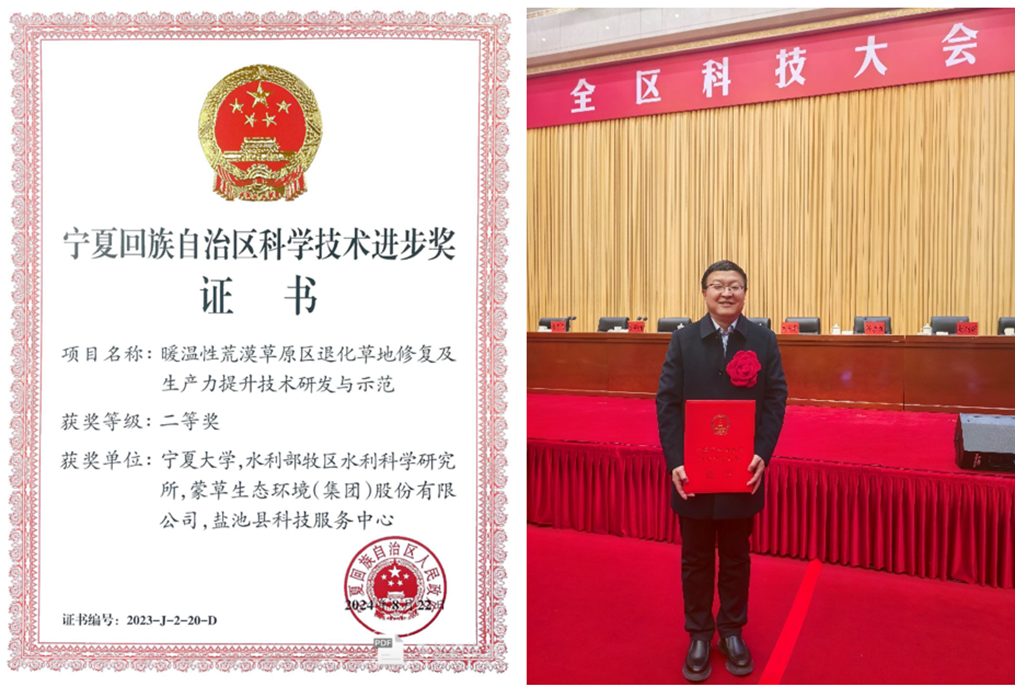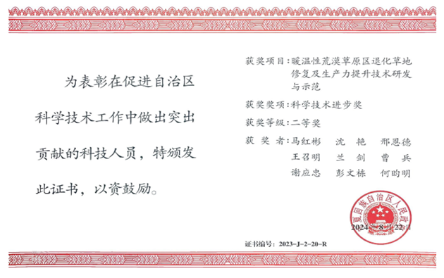 马红彬教授团队与学院林学学科、水利部牧区水利科学研究所等单位申报的“暖温性荒漠草原区退化草地修复及生产力提升技术研发与示范”获自治区科技进步二等奖。据悉,该成果在宁夏和内蒙古暖温性荒漠草原,诊断了草地生态现状,建立了退化荒漠草原修复技术、生态家庭牧场水-土-草-畜多元化调控模型和技术,构建了荒漠草原多元化饲草供给模式并进行示范推广,助力了暖温性荒漠草原草牧业高质量发展。